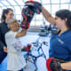 Alice Johnson, a Parkinson's disease patient, engages in boxing therapy with recreational therapists Lindsey Haberman (right) and Ashley Schauer. The sessions help boost strength, endurance, and balance.